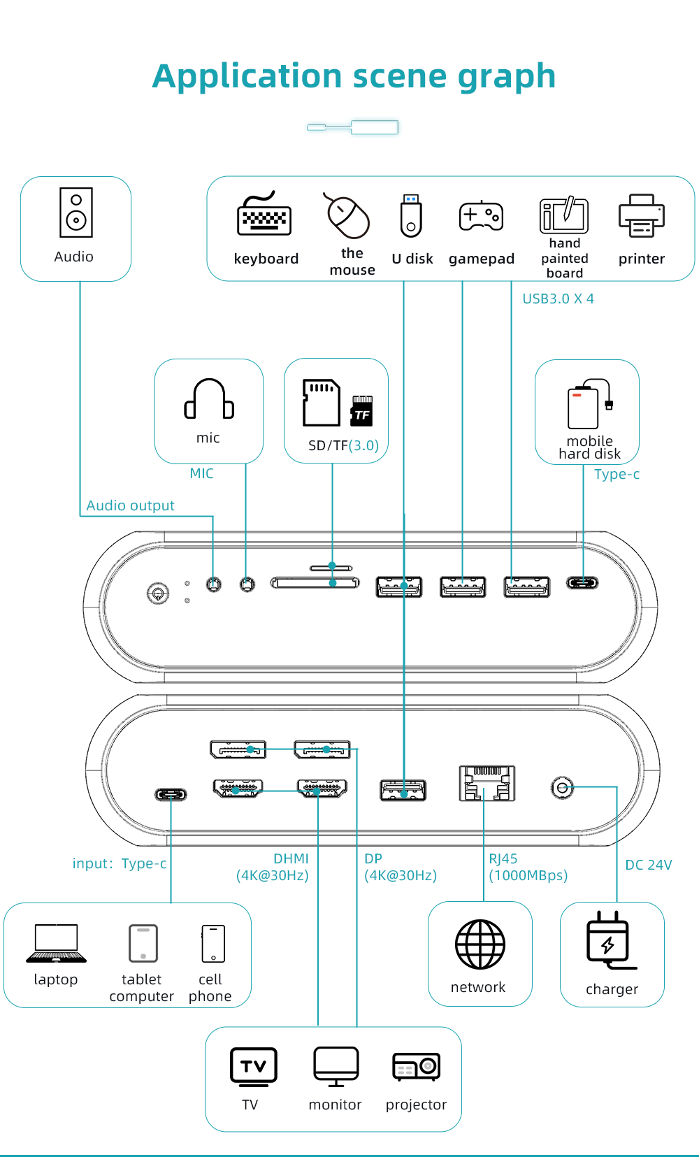 16 in 1 type-C to HDMI+usb3.0a/f+RJ45 /SD/TF/ audio docking station hub